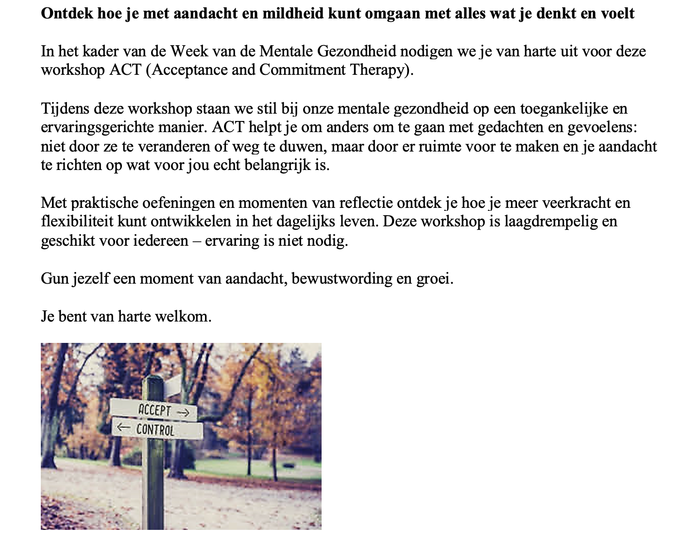 • Donderdag 4 juni 16:00-17:00 uur vindt er onder begeleiding van een psycholoog en praktijkondersteuner GGZ een workshop ACT (Acceptance and Commitment Therapy) plaats in wijkcentrum de Mortel. ACT is een moderne vorm van therapie die mensen helpt om beter om te gaan met moeilijke situaties in het leven.